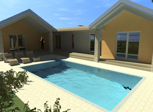 Lo spazio esterno si fonde con gli ambienti interni. Il giardino e la piscina diventano il proseguimento della casa, tanto a potere essere utilizzati direttamente dal soggiorno e dalle camere da letto, in un rapporto sempre mediato da patii che proteggono dal soleggiamento diretto. Il progetto, dalle linee pulite ed eleganti, rivolge lo suardo anche alla semplicità costruttiva e, di conseguenza all'aspetto economico. Il sogno caraibico diventà realzzabile ed alla portata di molti.